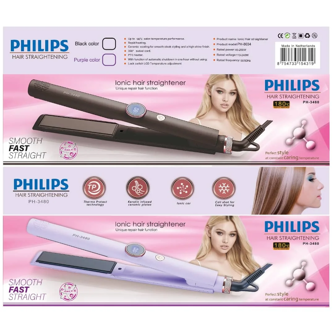 اتو دیجیتالی مارک فیلیپس مدل PH3480 جهت صاف کردن و کرلی کردن مو سیم چرخشی ۳۶۰ درجه قابلیت یونسازی جهت ترمیم موهای آسیب دیده